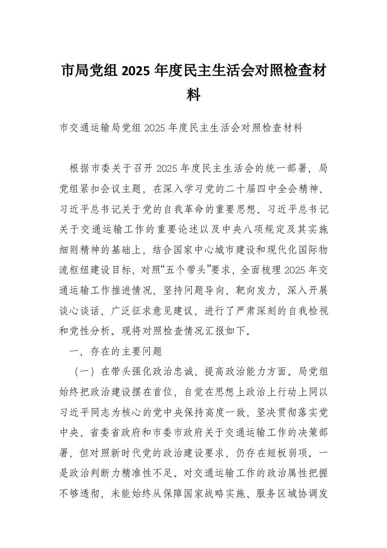 首页工作文档市局党组2025年度民主生活会对照检查材料